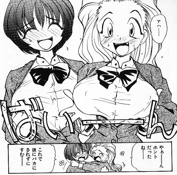 RaTe先生の作品では、変わった世界以外にも変わった能力を持った娘も出てきます。「神様の言うとおり」(1998年 ワニマガジン社)の中の短編「バブル・バスト・ガール」では、彼女のおっぱいを飲めば、誰でも巨乳になれる!という能力を持った少女が出てきます。